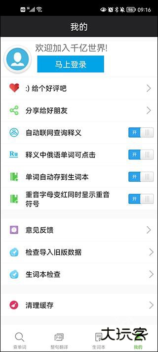 4、另外,在"我的”界面中用户可以手动设置联网查询释义,还可以对释义中的俄语单词进行点击,更是可以设置自动保存生词本。