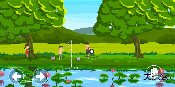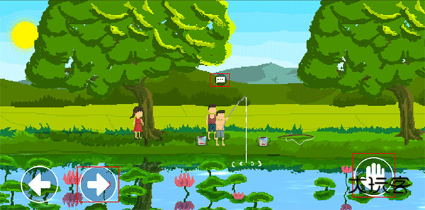 2、选择帮大宇钓鱼后继续向右移动到鱼竿处,在鱼竿上方出现对话图标后,点击右下角手印开始钓鱼。