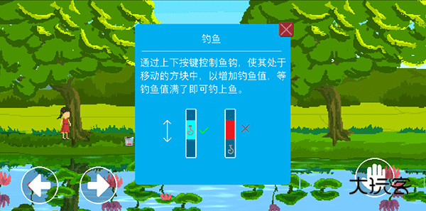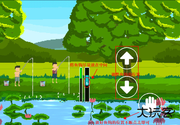 3、开始钓鱼小游戏后,可以将鱼钩放在中间位置,然后静等方块移动到位,玩家只需要一直点击右下角的按钮增加钓鱼值即可。钓到三条鱼后再与大宇对话,然后三个人开始玩木头人游戏。