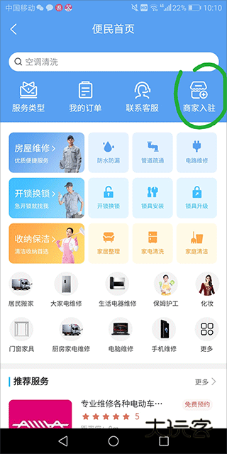 2、在打开的新页面中,选择屏幕上方右侧的“商家入驻”;