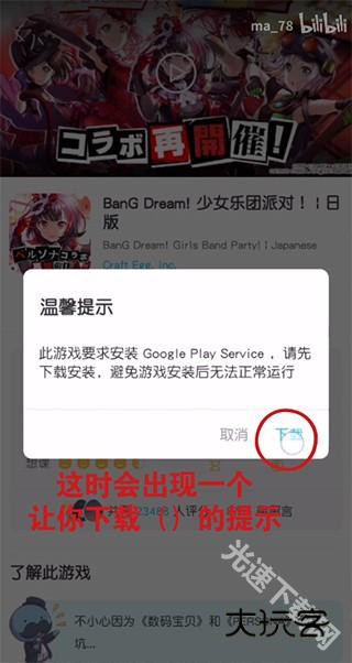2、这时会出现一个提示,此游戏要求安装Google Play Service,不用管它点击下载即可;