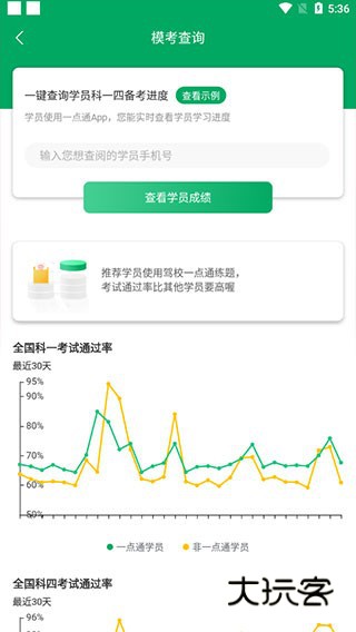 4、输入学员的手机号,可以轻松一键查询学员科一到科四的备考进度
