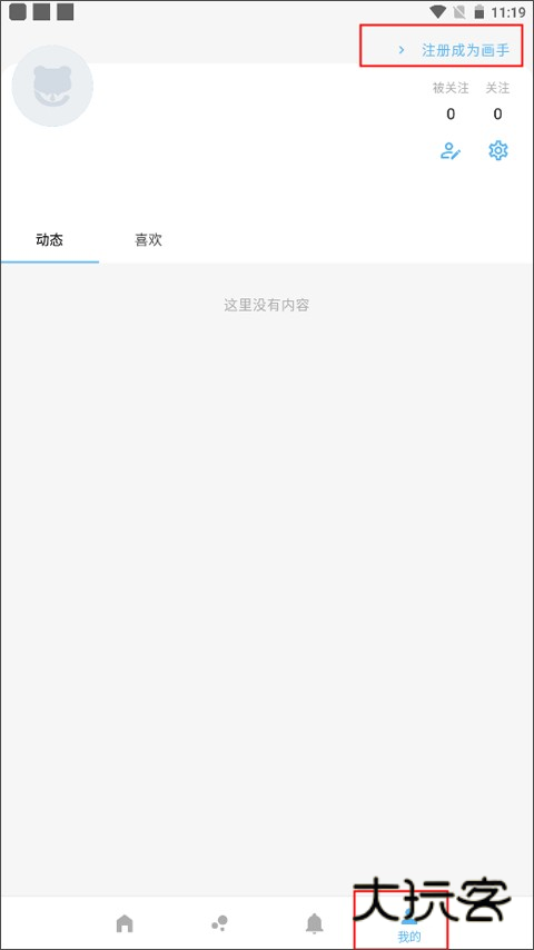 (1)选择下方菜单栏【我的】板块界面,这时你可以在右上角看到“注册成为画手”这几个文字,点击它。