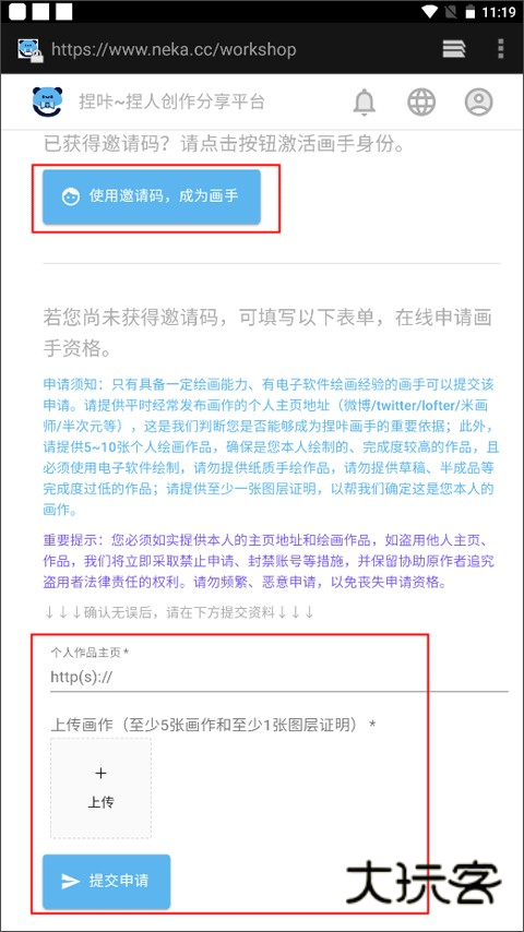 (3)如果你已经获取了邀请码,直接点击“使用邀请码,成为画手”这个按钮。如果没有,那么就像哟啊上传自己的作品主页、画作,最后提交申请就可以了,等系统审核通过之后就可以成为画手了。