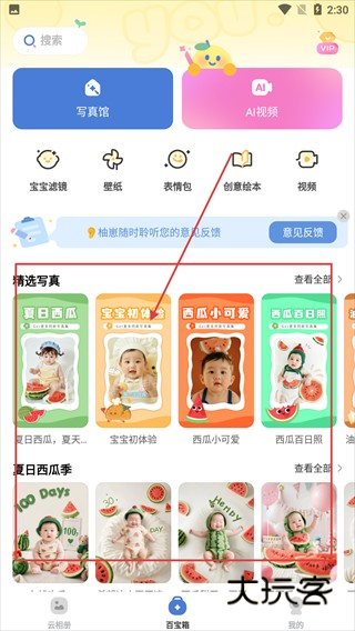 3、在【百宝箱】页面,可选择【写真馆】【AI视频】等功能,也能挑选【夏日西瓜】【宝宝初体验】等精选写真模板。