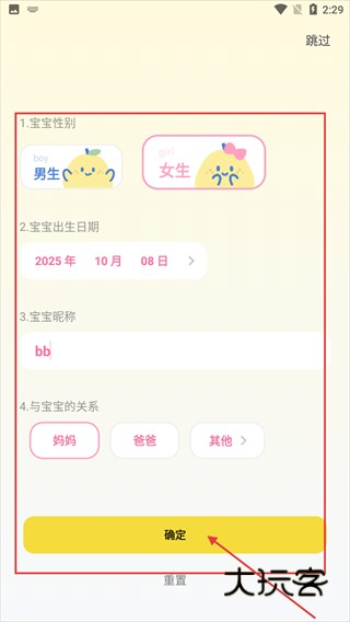 1、填写宝宝性别、出生日期【2025年-10月-08日】、昵称【bb】、与宝宝关系后,点击【确定】完成信息设置。