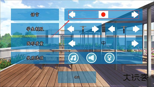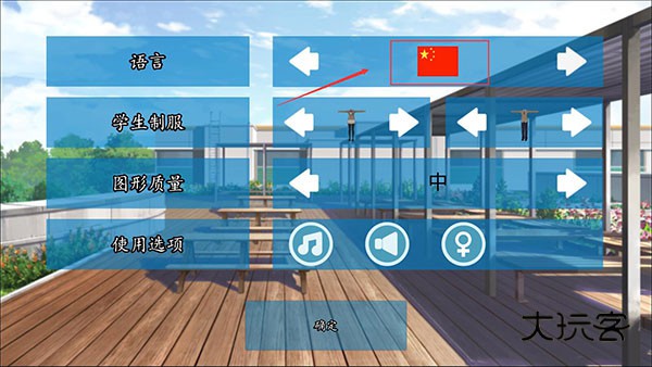 2、该选项界面中,第一个是用来修改角色的语言,其次是画质设置(可能不太准确),第三个则是可以修改NPC的服饰,最后还有性别改变的选项。想要更换衣服的玩家,女性角色请点击第二个选项,男性角色请点第三个。