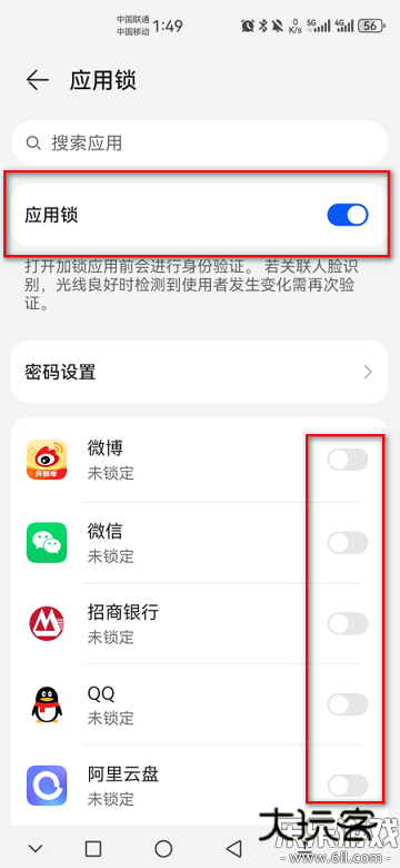 5.应用锁已经开启,对应的软件密码锁可以点击右边的按钮进行开启。