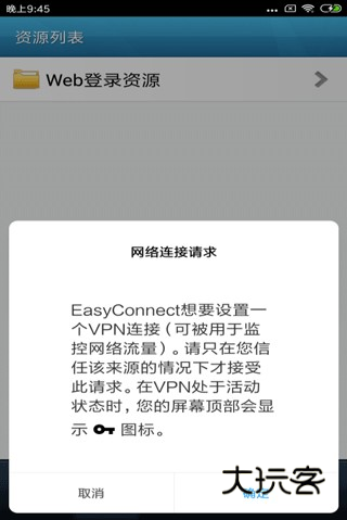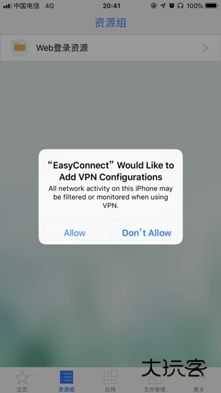3、第一次登录VPN可能会弹出如下英文提示,选择“Allow”。随后会自动跳转至网络连接请求界面,点击“确定”完成验证。