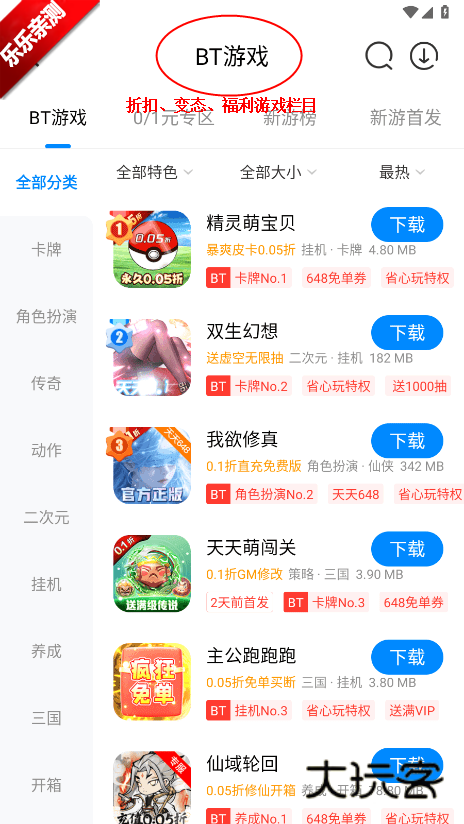 3、bt游戏,收录了各种折扣、变态、福利等充值折扣手游;