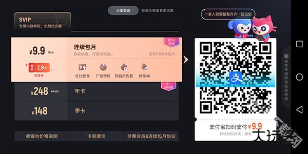 2、关于酷喵会员套餐资费情况可以前往酷喵影视app应用中点击顶部的会员图标,然后进入会员详情页面中进行查看,并可在线支付开通