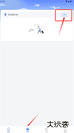 3、切换至行程页面里,点击添加按钮录入相关出行信息。