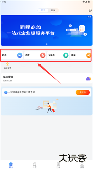 2、在首页中,根据需要选择机票或酒店等服务预订差旅资源。