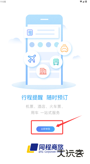 1、启动同程商旅应用,点击立即体验进入综合服务平台。