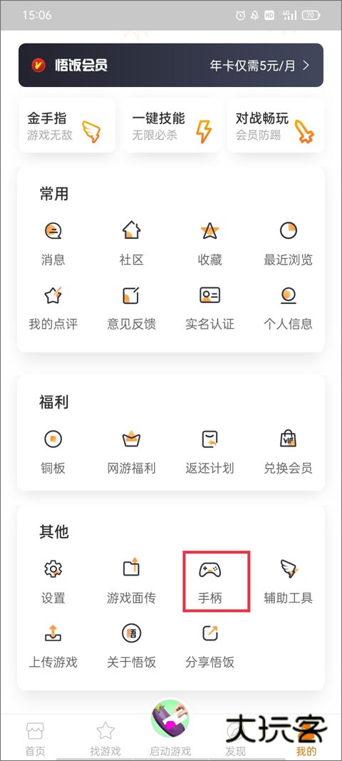1、首先将页面切换到【我的】界面,选择“其他”里面的手柄选项并点击它。