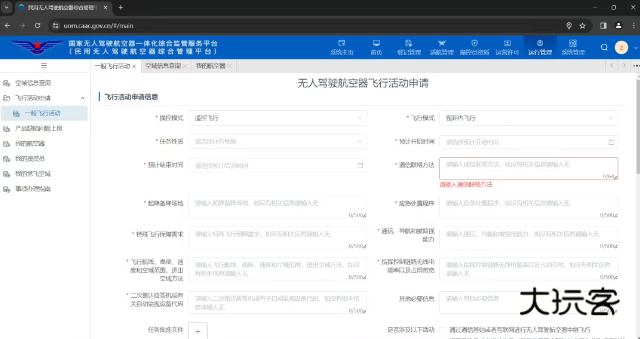 登录后进入首页――点击右上角运行管理――飞行活动申请――一般飞行活动。