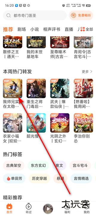 1、来到首页可以开始选择,各种想说、音乐、相声等这里都有