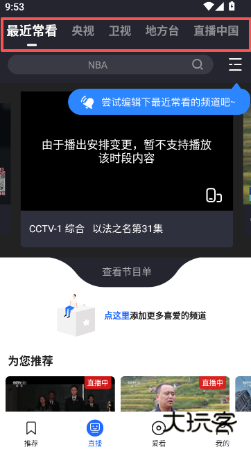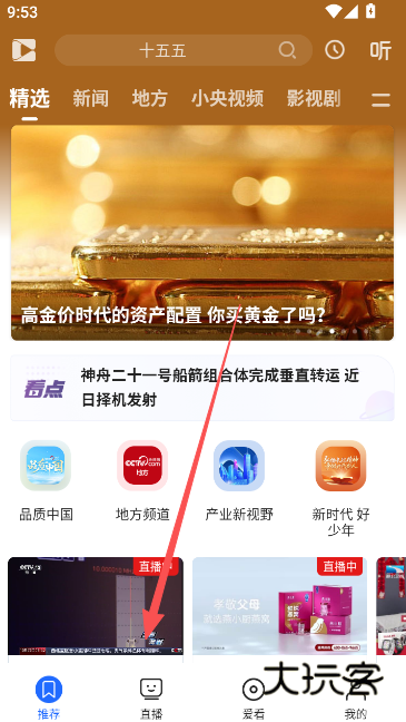 1、cntv中国网络电视台直播精选多个系列央视台直播内容,看直播可在推荐页看,或是直接转到直播版块查看。