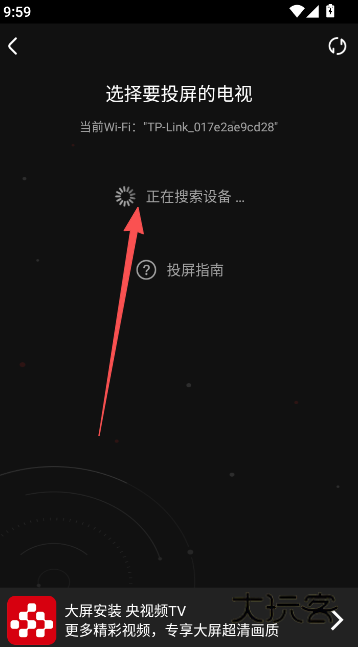 2、等待cntv客户端搜索电视设备,完成电视投屏操作。