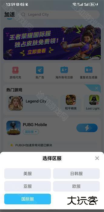 1、首先需要准备一个加速器,然后在加速器界面选择【日韩服】,因为锁区严重,不选亚服要好一点;