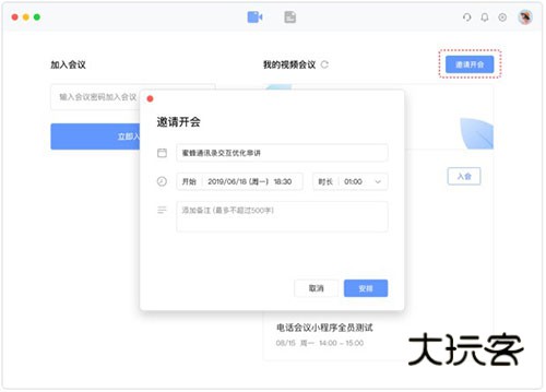 点击「邀请开会」按钮,输入会议主题、时间即可快速安排一场会议;