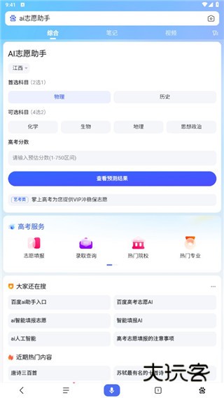 1、在本站下载安装并打开软件,在搜索框中输入AI志愿助手,即可进入百度AI志愿助手,在这里,你可以进行志愿报考分析;