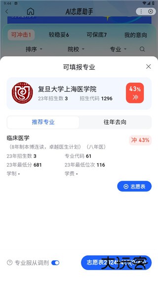 5、之后再预测出志愿填报推荐,会清晰的显示该院校的招生代码,及招生人数、可填报的专业;