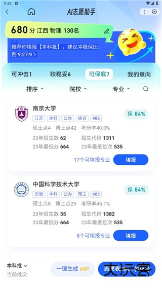 我们根据学生的成绩,推荐短跑、安全、安全网等不同层次的大学,分析大学的历史招生情况,提供各大学的优势学科、历史招生数据、硕士和博士课程等信息。