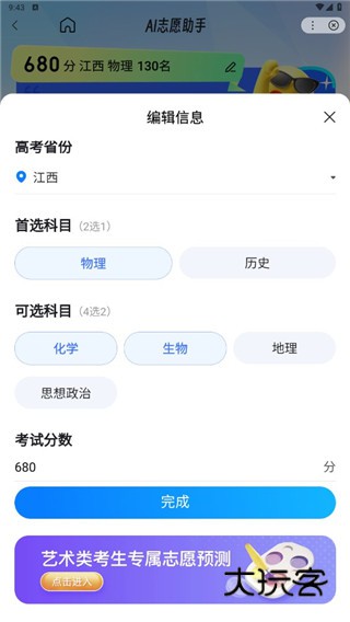 2、依次输入所在的的省份、批次、科目、分数等信息即可;
