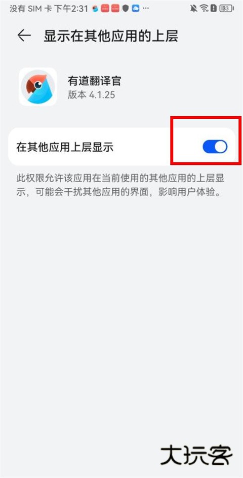 4、大家可根据自身手机设置来进行设置,如小编所示点击开启【允许显示在其他应用上方】的按钮即可