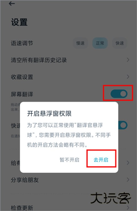 3、跳转自【设置】页面,点击【屏幕翻译】,让其功能开启,并【去开启】悬浮窗权限