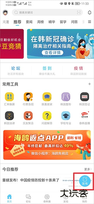 1、打开奋斗在韩国app,在首页中点击右下角发布
