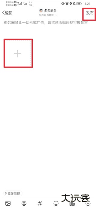3、然后将内容编辑完成,需要加照片的话可以点击加号框框进行添加照片,最后点击发布即可