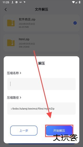 3、最后,输入压缩名称、更换压缩路径,点击【开始解压】按钮。