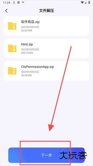 2、其次,进入文件解压界面,选择需要解压的文件,点击【下一步】按钮。