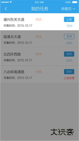重复上面操作,点击右上角的,选取“待提交”,此处显示执行成功的任务,在这里可以执行“上传”的提交操作。