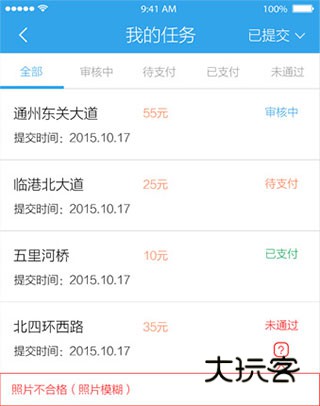 重复上面操作,点击右上角,选取“已提交”,此处显示已提交任务的状态,其中分为“审核中”、“待支付”、“已支付”、“未通过”。其中选择“未通过”可以查看未通过任务的原因。
