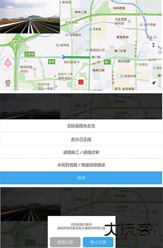 点击画面左下角的“报错”按钮。根据实际情况选择对应的选项。“实际道路未走完”、“前方已没路”、“施工中”、“路过窄” 、“未找到任务”、“任务消息错误”等,然后软件提示“您的反馈已收到,请按照实际路况及交通规则照常行驶”