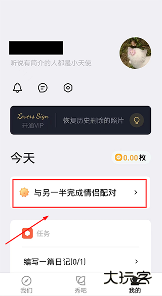 2、进入【我的页面】,点击【与另一半完成情侣配对】;