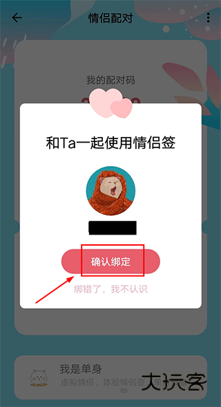 4、确定是对方无误后,点击【确认绑定】即可。之后双方都就可以在这里记录恋爱日常了哦!