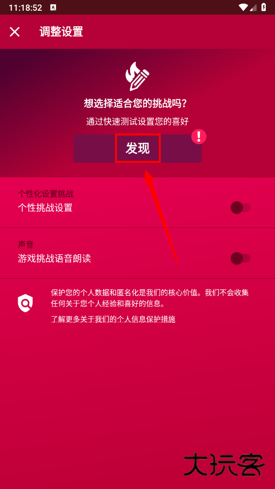 2、如图,点击"发现"进入,通过快速测试设置您的喜好。