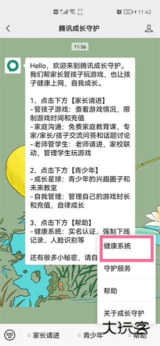 1、关注微信腾讯成长守护公众号,点击帮助导航栏,选择【健康系统】
