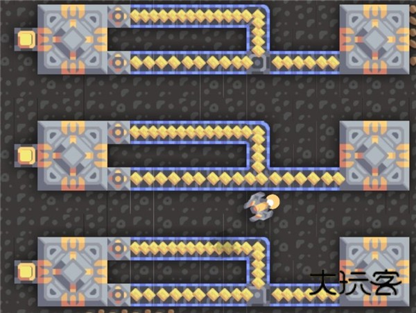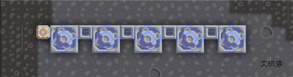 注意B不接受带输入,A也不接受桥下的带输入,所以在输出资源时,往往需要多安置一个传送桥单体,让最外面(上图为最上面的一排钻头,共四个)的钻头也能正常输出。