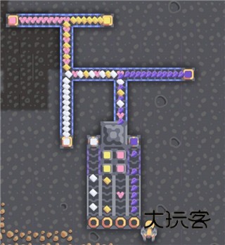 这个也是放松了对材料的要求,没有追求满效率,让蓝图更好看。我觉得比较精妙的地方是那两个沙的分类器。原本没有上方的抽水机,沙子是直接运下去的,一个分类器直接承担了沙子,硅,煤三种材料的分配。加了抽水机之后也能负责把煤往下运,硅往左右运。