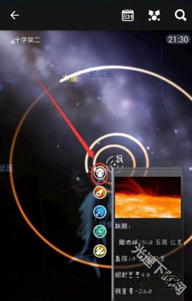 我们还可以在恒星资料左侧点击第一个图标(下图红色箭头所指)这时点击这个图标是可以登录到太阳上的,登录的距离也会计算出的