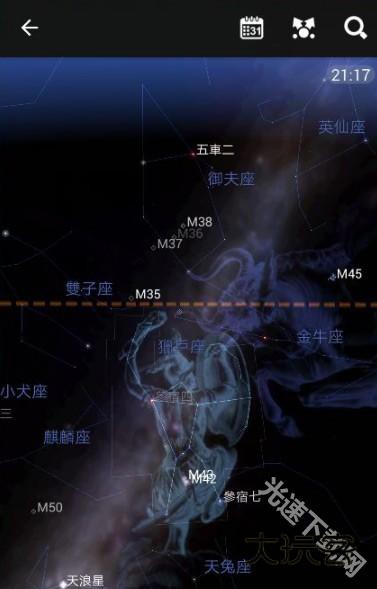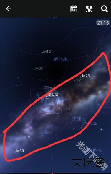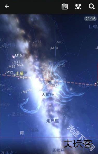 小编进入系统的坐标当然是地球了,因为小编是在地球上操作的,此时用户只需要用手指旋转界面,找到明亮的光带,那就是银河。下面三图为银河中的天鹅座、天蝎座和猎户座,这些位置都是实时的