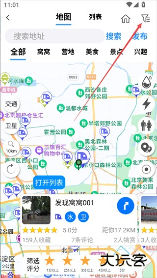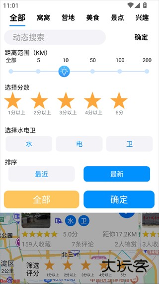 2、点击列表下方的【窝窝】,再点击页面右上角的筛选图标,设置距离范围、风格、排序方式,找到适合的窝窝地址。