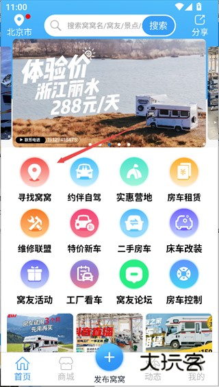 1、首先打开窝友自驾APP,点击【寻找窝窝】。
