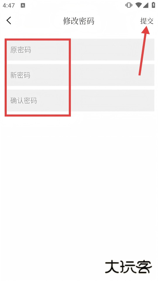 4、在密码修改页面,依次填写【原密码】【新密码】【确认密码】,点击【提交】完成密码修改。