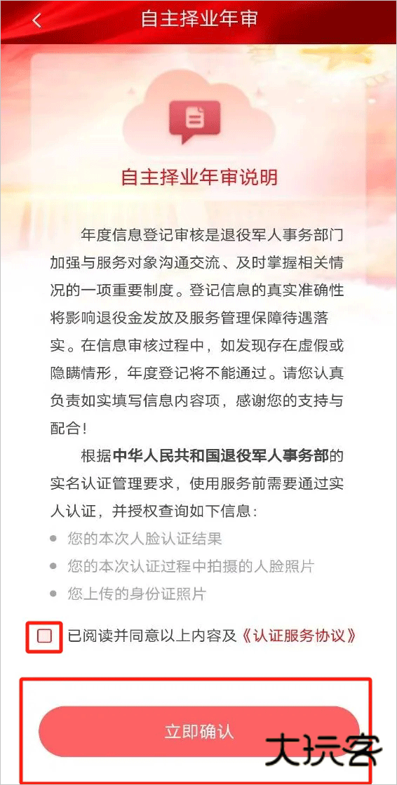 第三步:跳转至年审说明页面,勾选”已阅读并同意以上内容及《认证服务协议》”,点击“立即确认”,跳转至基本信息填写页面。